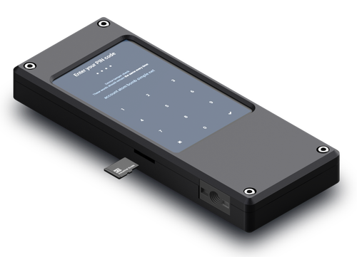 Hardware wallet with a multi-factor authentication system and carbon key backup. Dual-chip architecture for security.